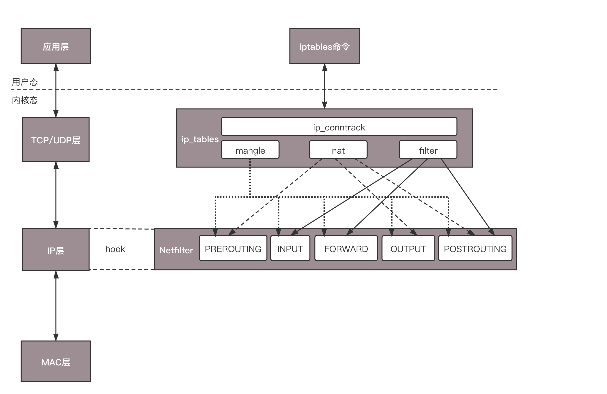 内核模块 ip_tables 在这五个节点上埋下函数,从而可以根据规则进行包的处理。按功能可分为四大类:连接跟踪(conntrack)、数据包的过滤(filter)、网络地址转换(nat)和数据包的修改(mangle)